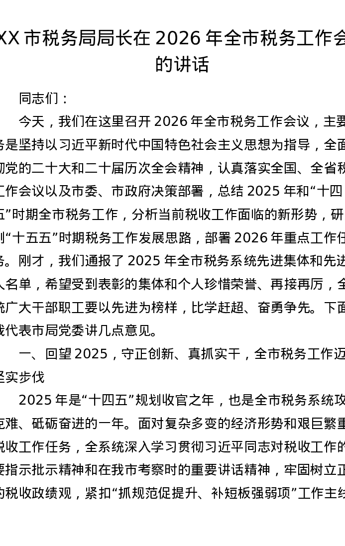 XX市税务局局长在2026年全市税务工作会上的讲话2