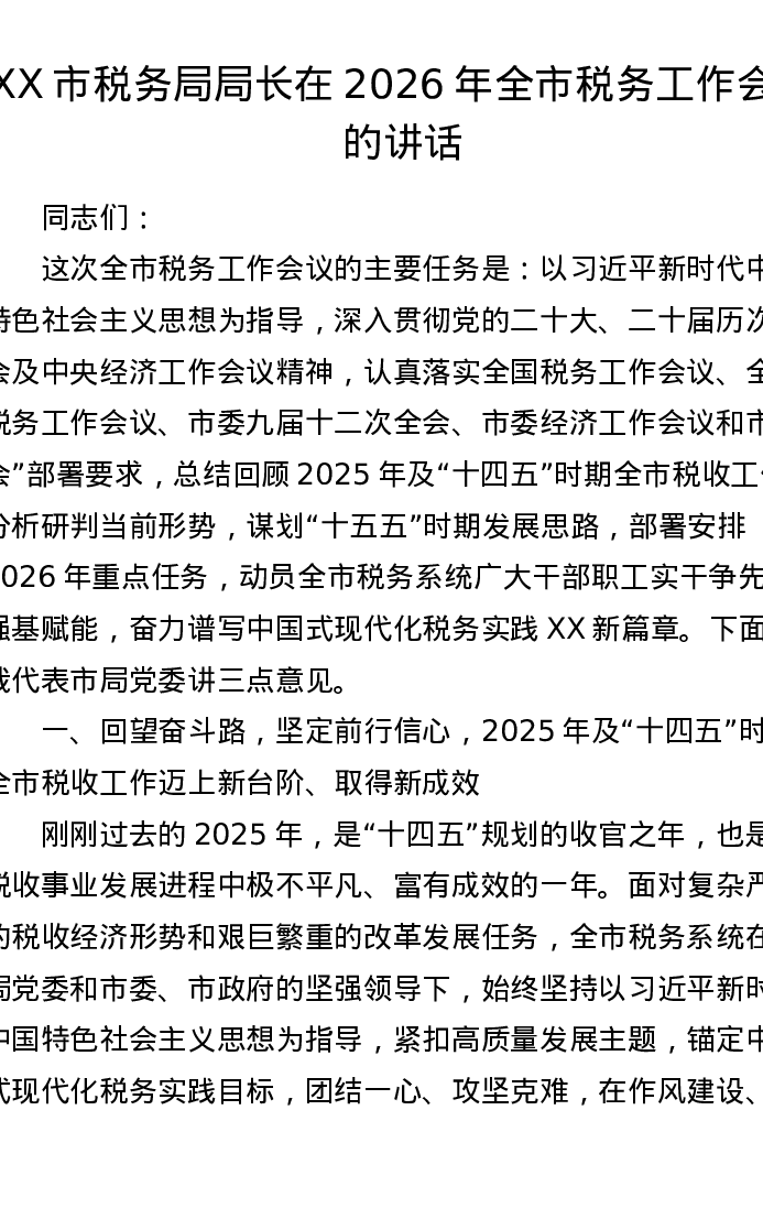 XX市税务局局长在2026年全市税务工作会上的讲话3