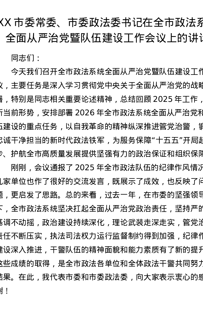 XX市委常委、市委政法委书记在全市政法系统全面从严治党暨队伍建设工作会议上的讲话(4559字)