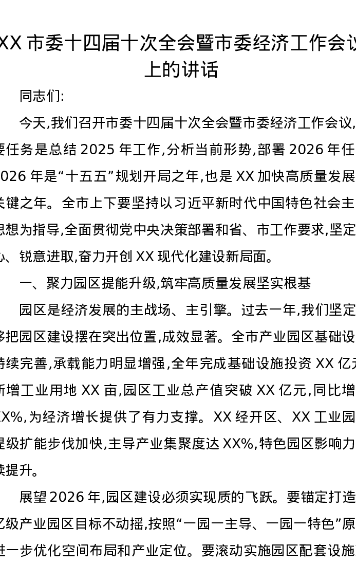 XX市委十四届十次全会暨市委经济工作会议上的讲话