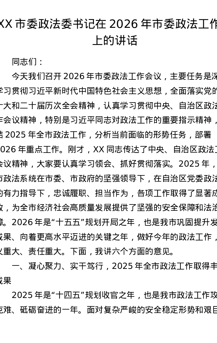 XX市委政法委书记在2026年市委政法工作会上的讲话