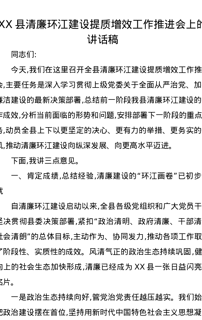 XX县清廉环江建设提质增效工作推进会上的讲话稿