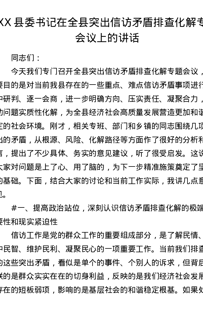 XX县委书记在全县突出信访矛盾排查化解专题会议上的讲话(4814字)