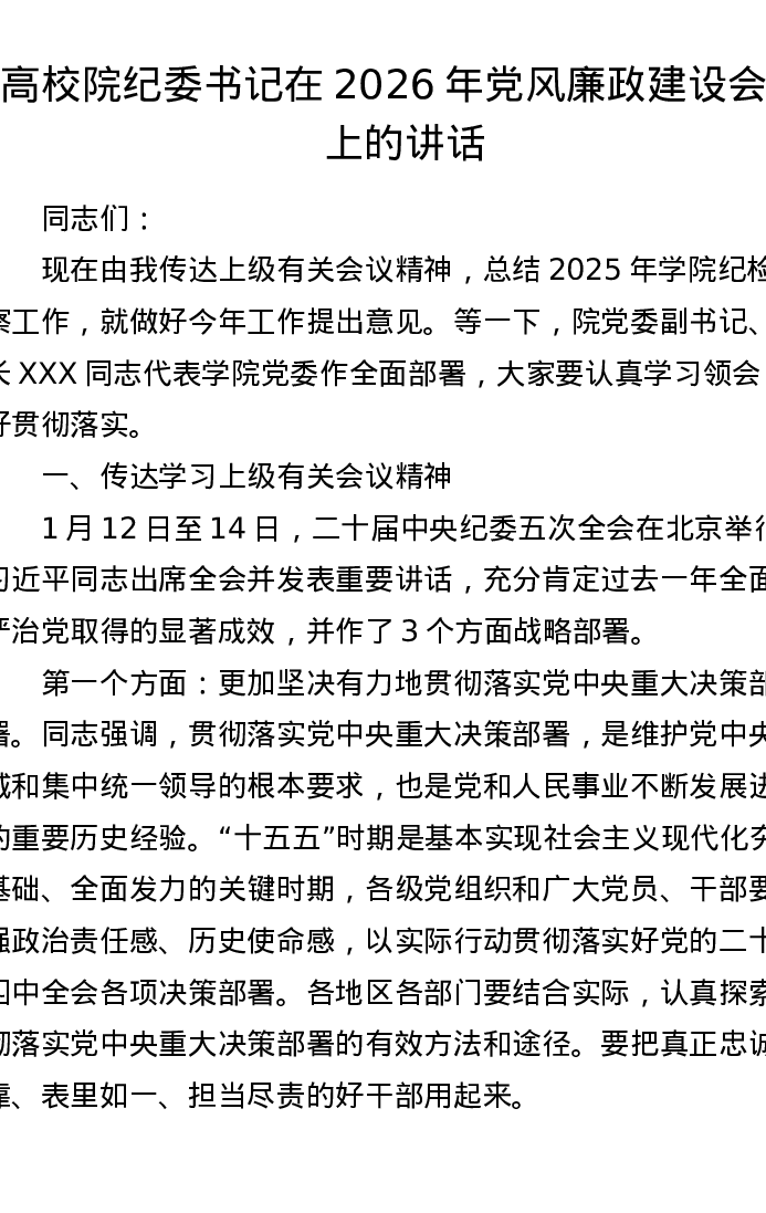 高校院纪委书记在2026年党风廉政建设会议上的讲话