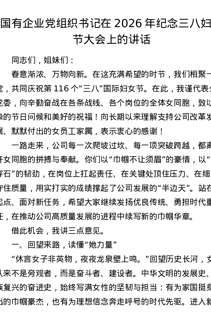 国有企业党组织书记在2026年纪念三八妇女节大会上的讲话