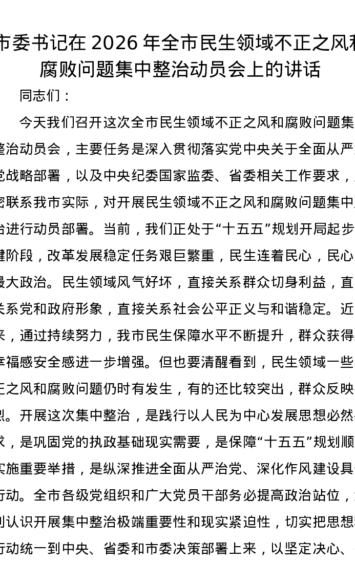 市委书记在2026年全市民生领域不正之风和腐败问题集中整治动员会上的讲话