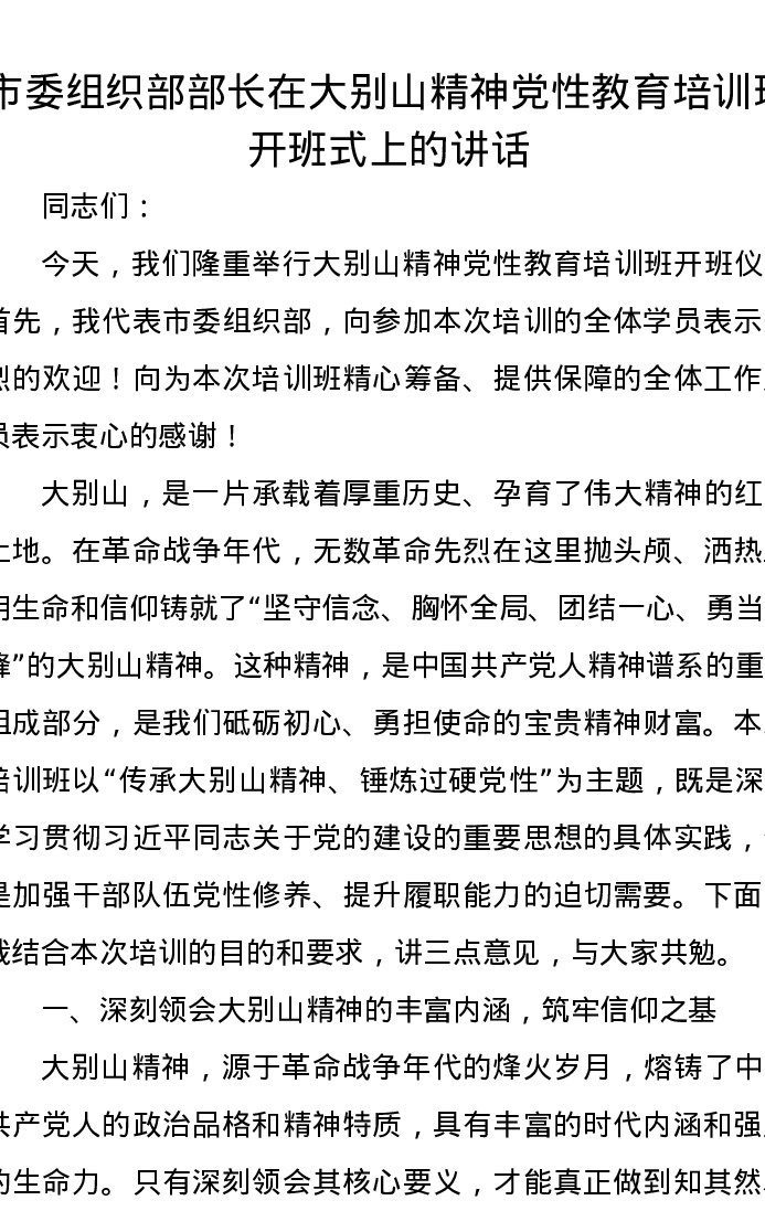 市委组织部部长在大别山精神党性教育培训班开班式上的讲话