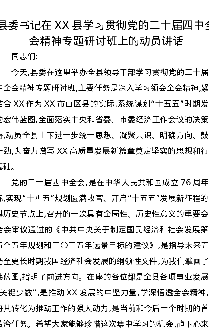 县委书记在XX县学习贯彻党的二十届四中全会精神专题研讨班上的动员讲话