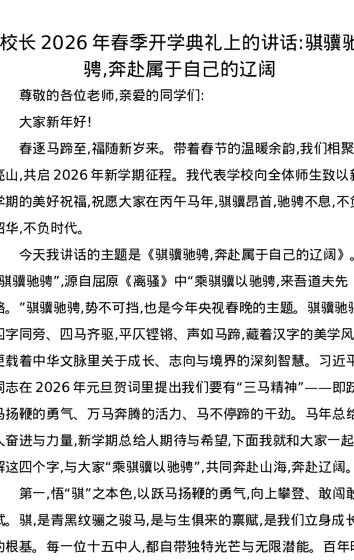 校长2026年春季开学典礼上的讲话:骐骥驰骋,奔赴属于自己的辽阔