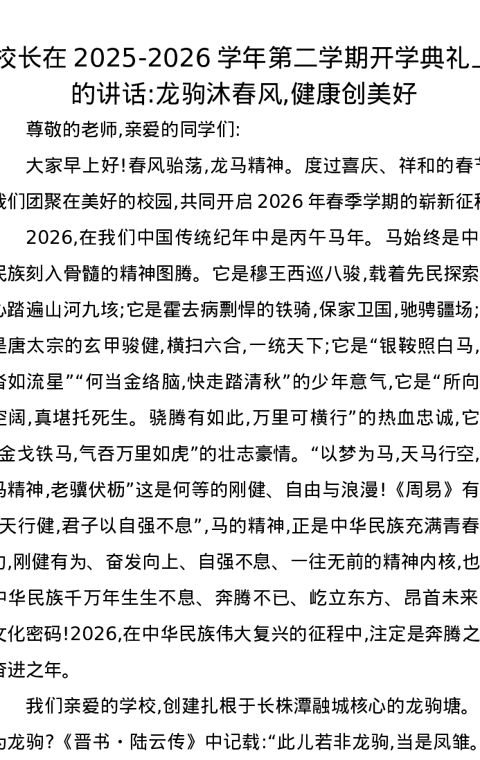 校长在2025-2026学年第二学期开学典礼上的讲话龙驹沐春风,健康创美好