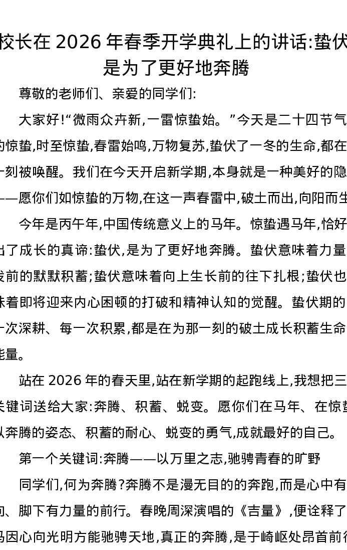 校长在2026年春季开学典礼上的讲话蛰伏,是为了更好地奔腾