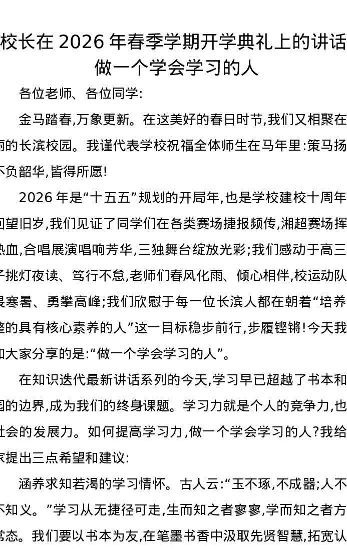 校长在2026年春季学期开学典礼上的讲话做一个学会学习的人