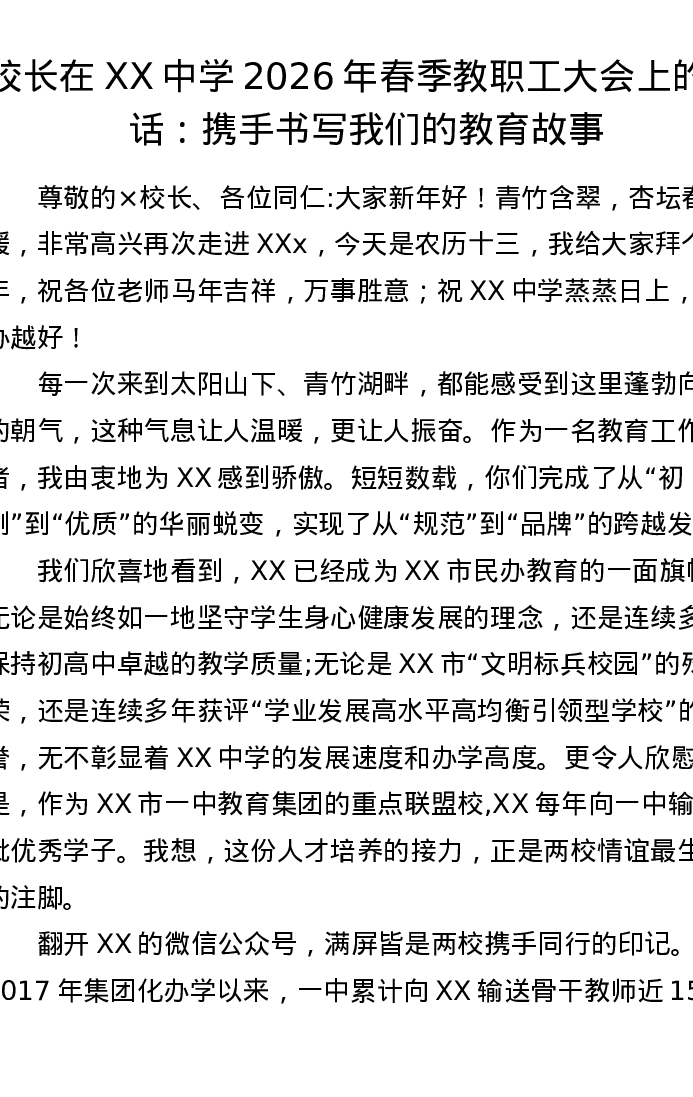 校长在XX中学2026年春季教职工大会上的讲话:携手书写我们的教育故事