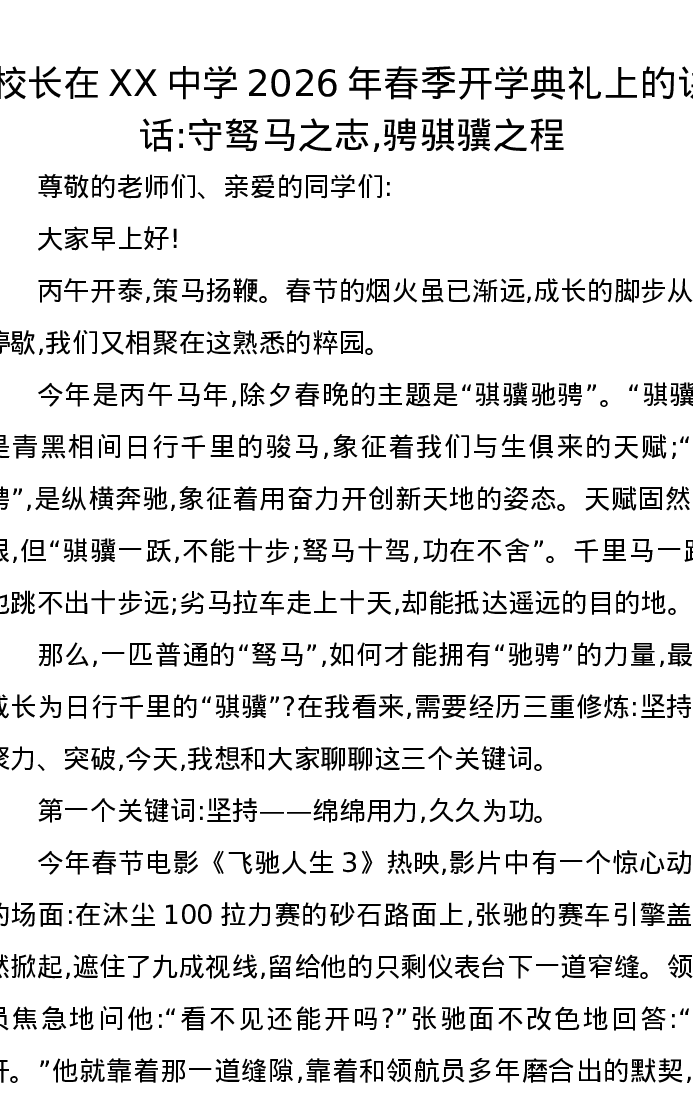 校长在XX中学2026年春季开学典礼上的讲话守驽马之志,骋骐骥之程