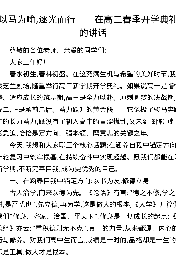 以马为喻,逐光而行——在高二春季开学典礼上的讲话
