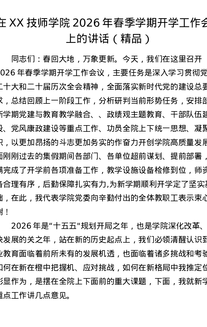 在 XX 技师学院2026年春季学期开学工作会议上的讲话