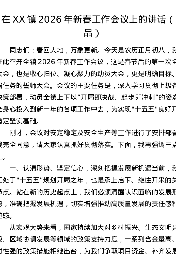在 XX镇2026年新春工作会议上的讲话