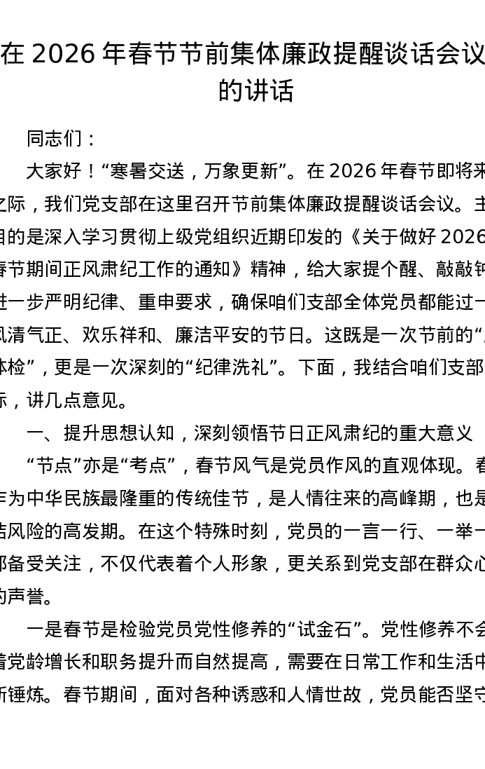 在2026年春节节前集体廉政提醒谈话会议上的讲话
