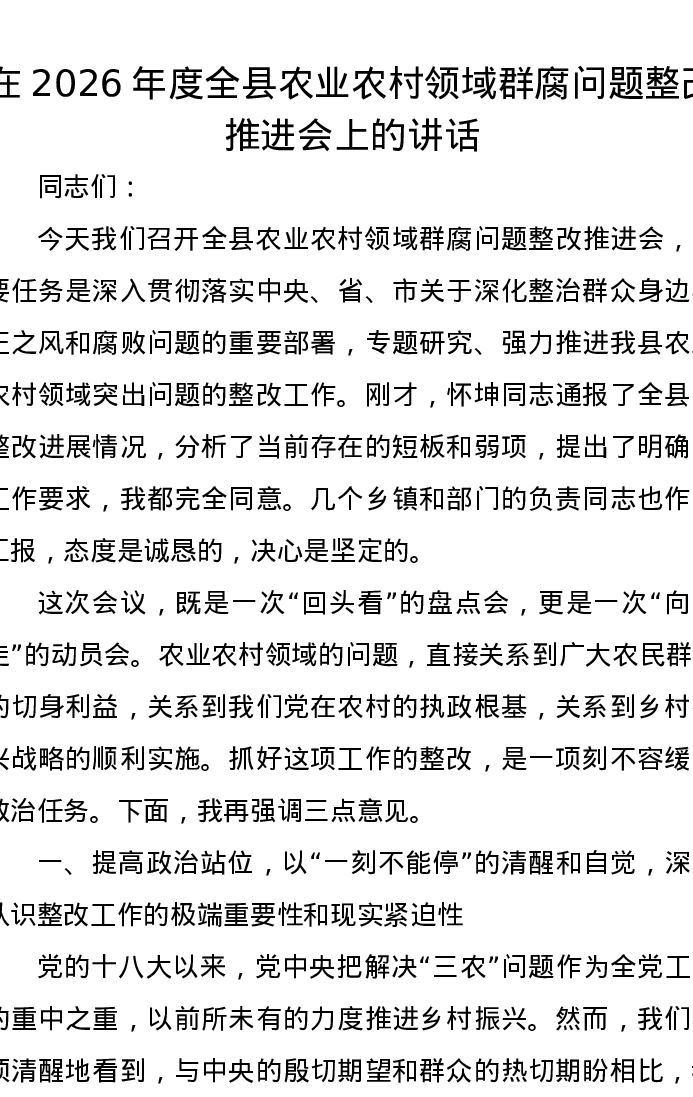 在2026年度全县农业农村领域群腐问题整改推进会上的讲话