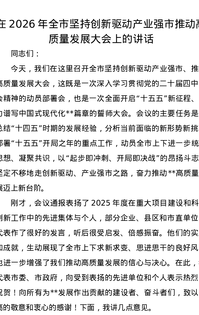 在2026年全市坚持创新驱动产业强市推动高质量发展大会上的讲话