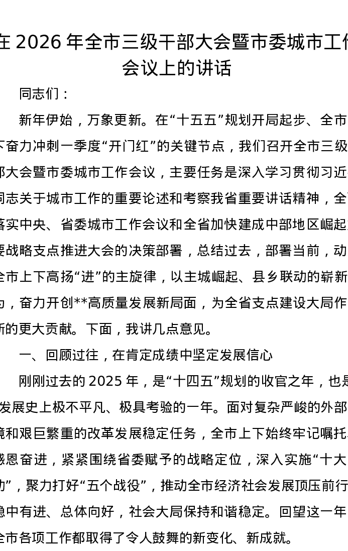 在2026年全市三级干部大会暨市委城市工作会议上的讲话