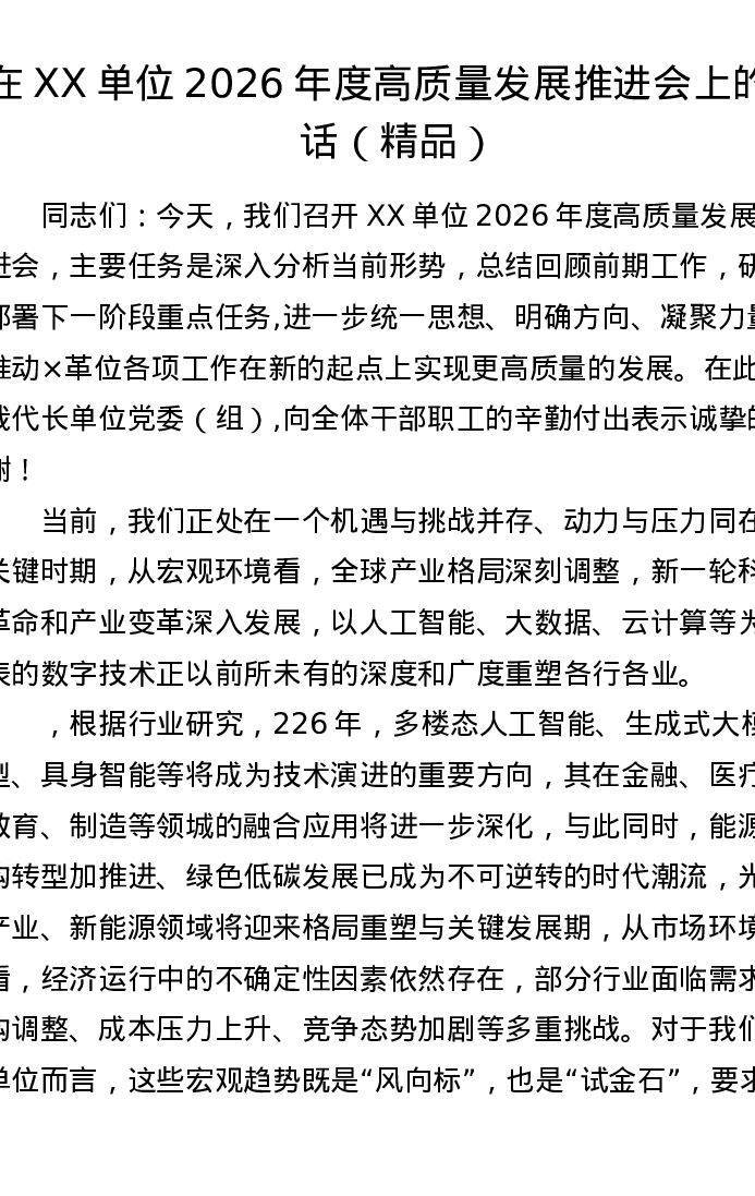 在XX 单位2026 年度高质量发展推进会上的讲话
