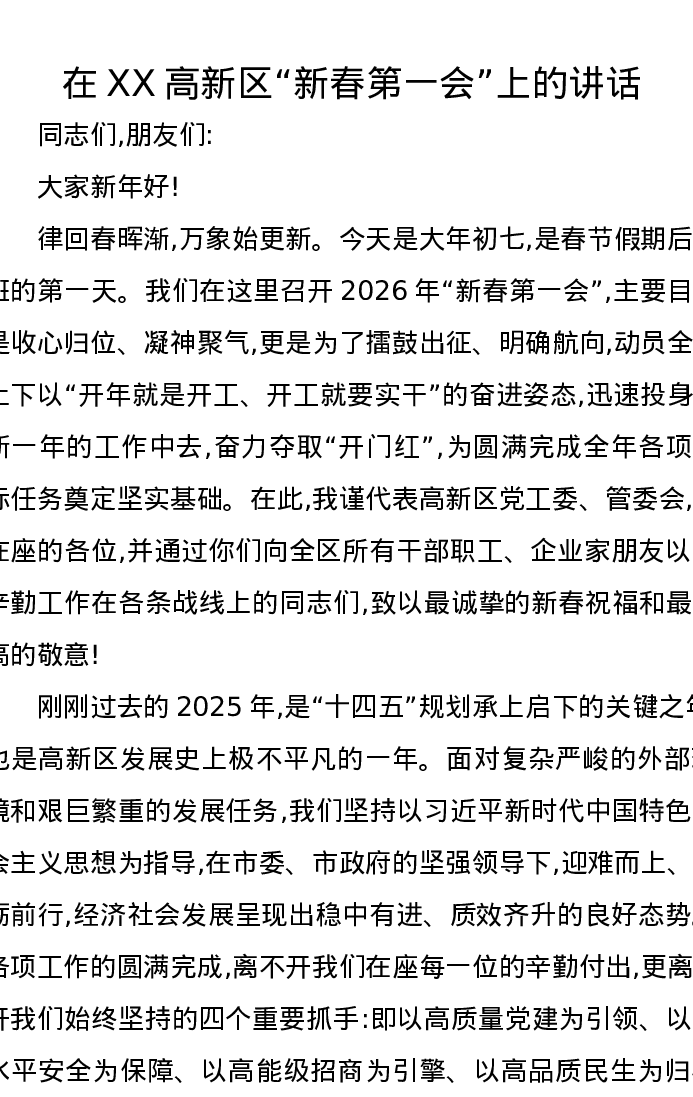在XX高新区新春第一会上的讲话