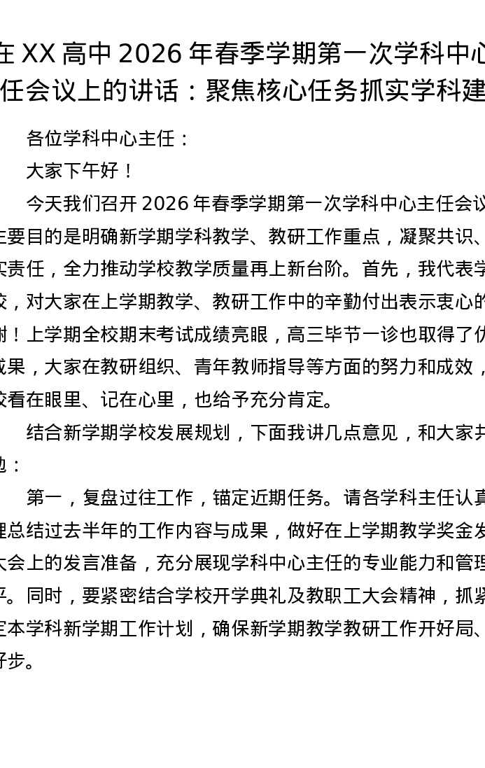 在XX高中2026年春季学期第一次学科中心主任会议上的讲话:聚焦核心任务抓实学科建设