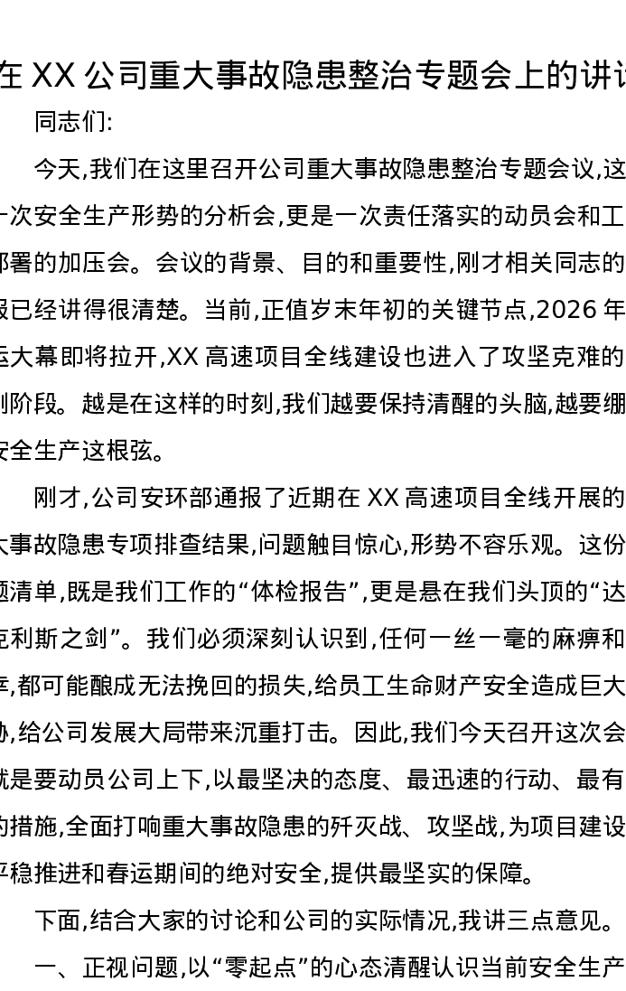 在XX公司重大事故隐患整治专题会上的讲话