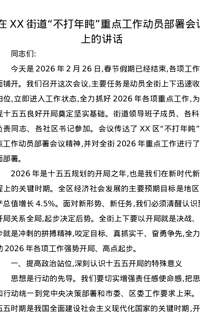 在XX街道不打年盹重点工作动员部署会议上的讲话