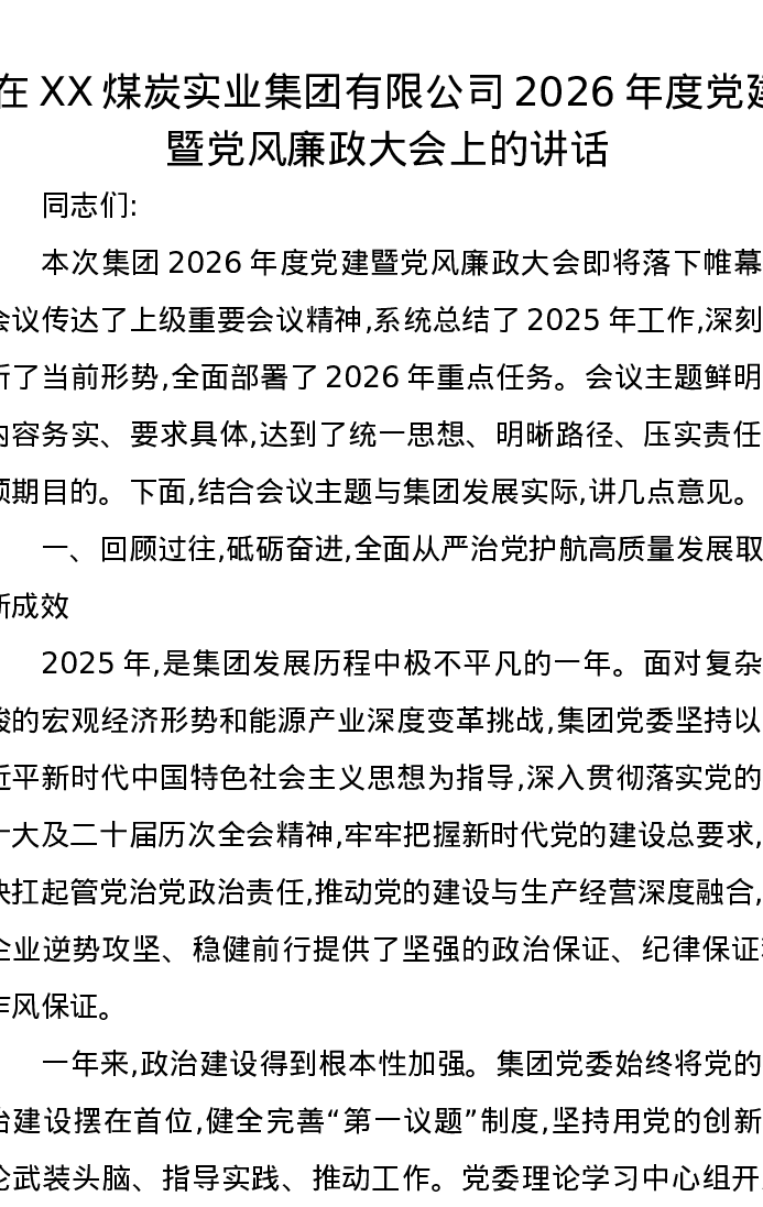 在XX煤炭实业集团有限公司2026年度党建暨党风廉政大会上的讲话
