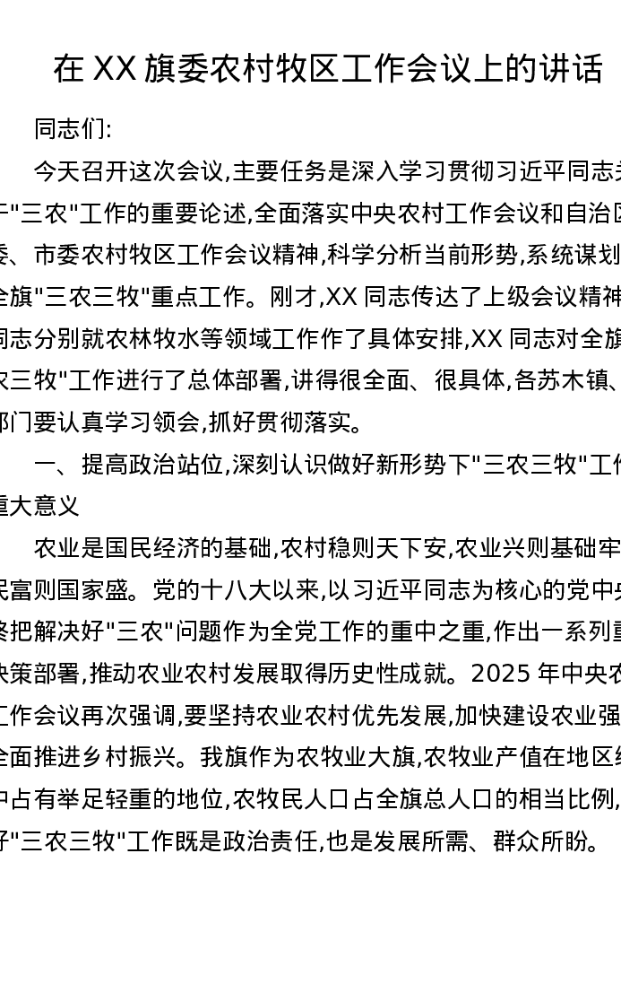 在XX旗委农村牧区工作会议上的讲话