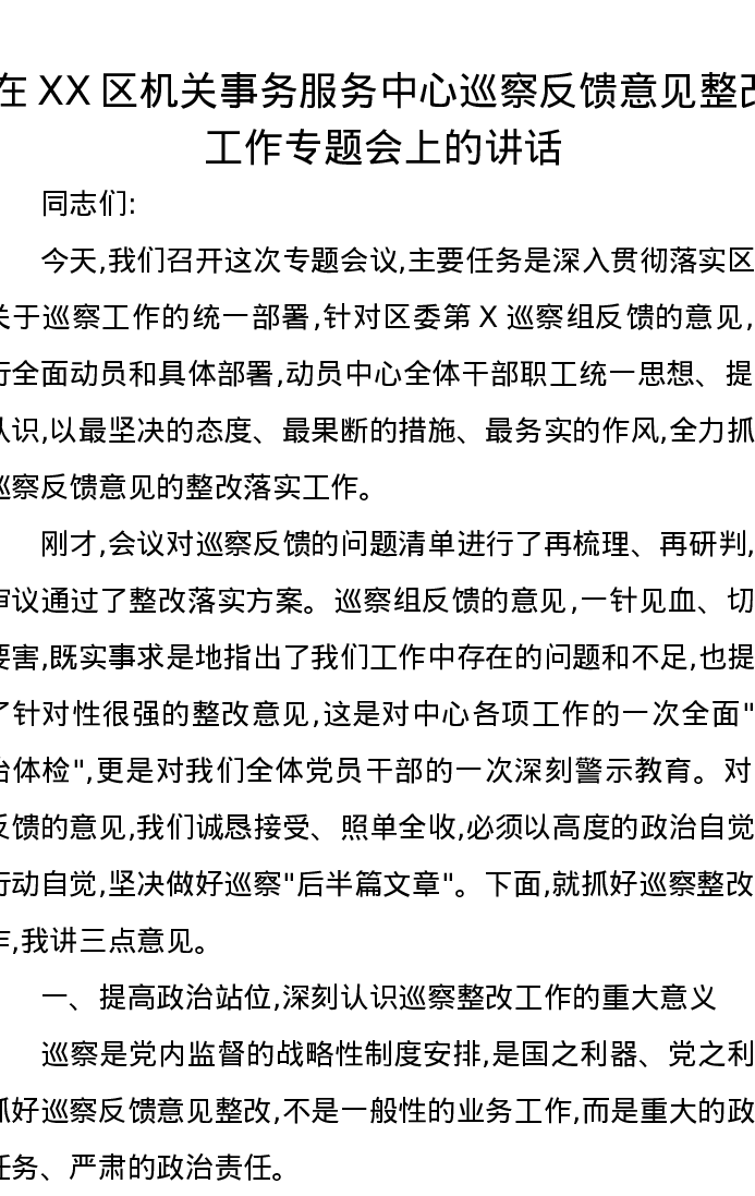 在XX区机关事务服务中心巡察反馈意见整改工作专题会上的讲话