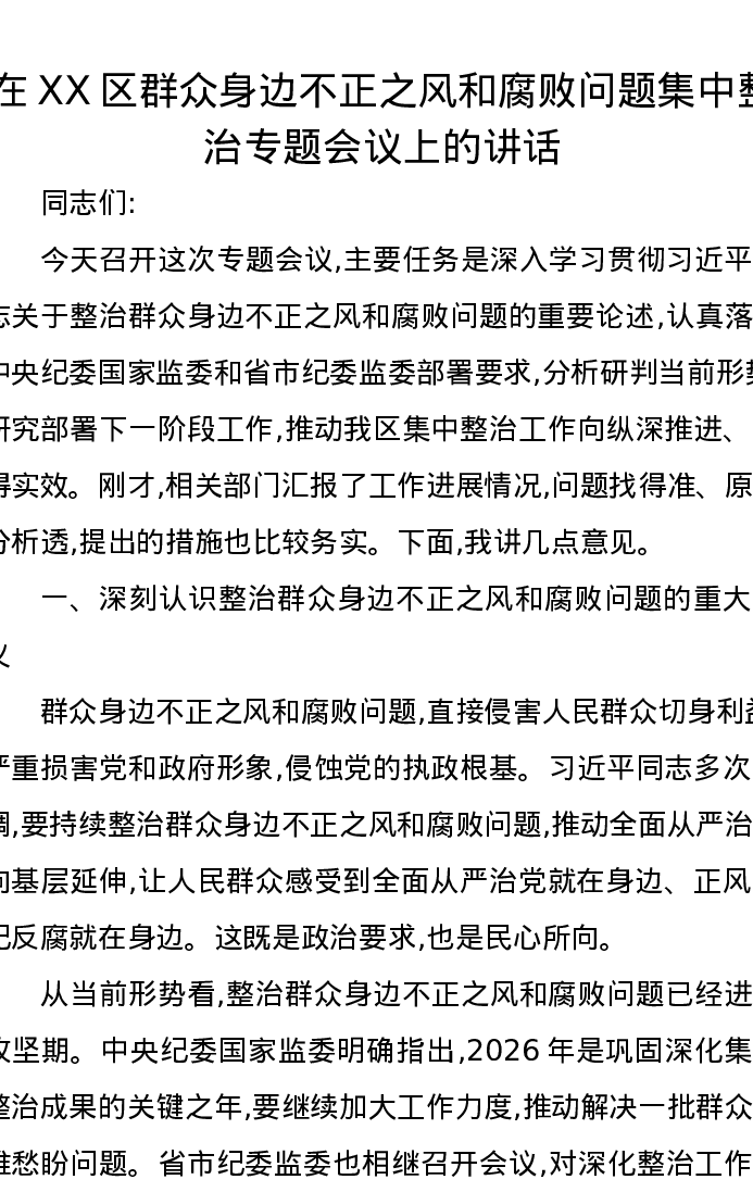 在XX区群众身边不正之风和腐败问题集中整治专题会议上的讲话