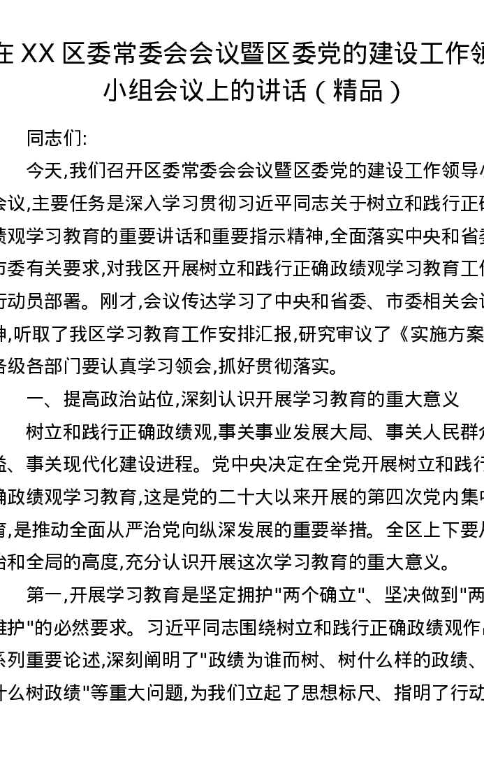 在XX区委常委会会议暨区委党的建设工作领导小组会议上的讲话