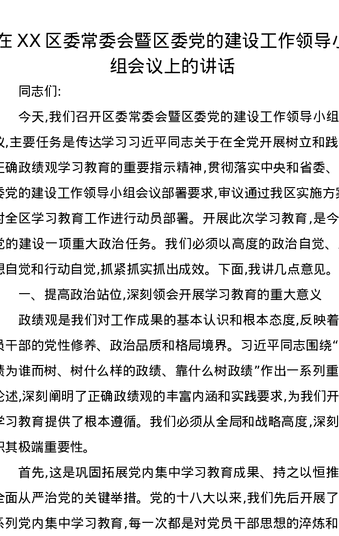 在XX区委常委会暨区委党的建设工作领导小组会议上的讲话