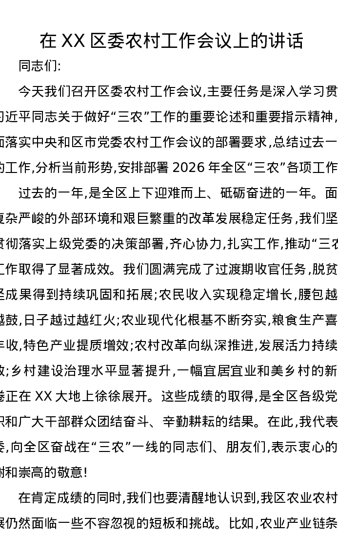 在XX区委农村工作会议上的讲话2