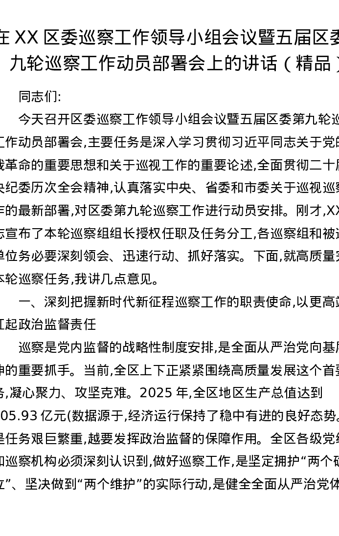 在XX区委巡察工作领导小组会议暨五届区委第九轮巡察工作动员部署会上的讲话