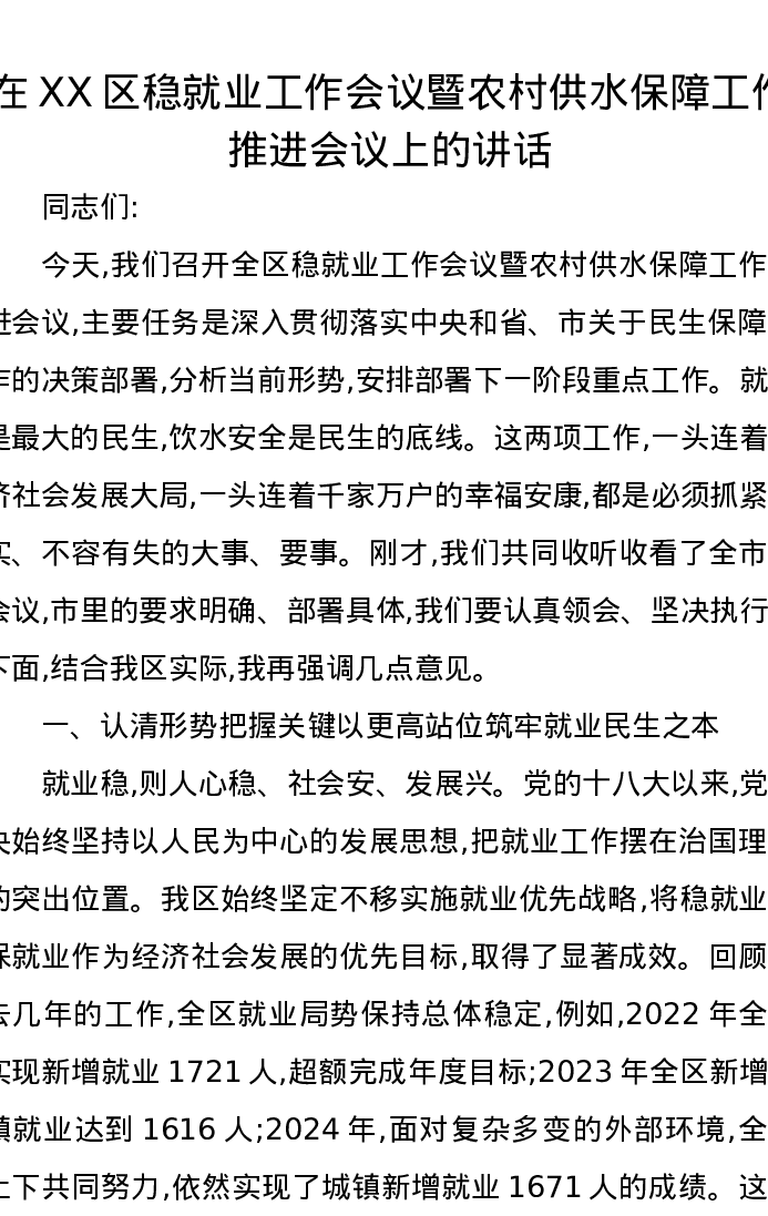 在XX区稳就业工作会议暨农村供水保障工作推进会议上的讲话