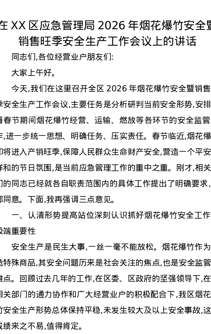 在XX区应急管理局2026年烟花爆竹安全暨销售旺季安全生产工作会议上的讲话