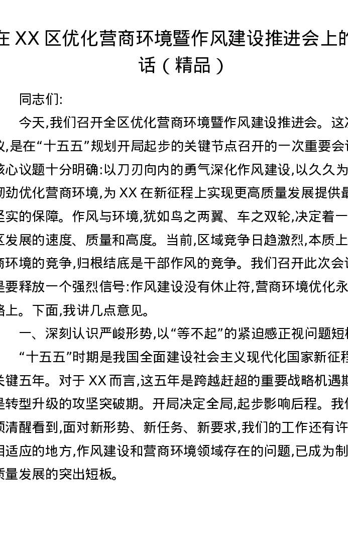 在XX区优化营商环境暨作风建设推进会上的讲话