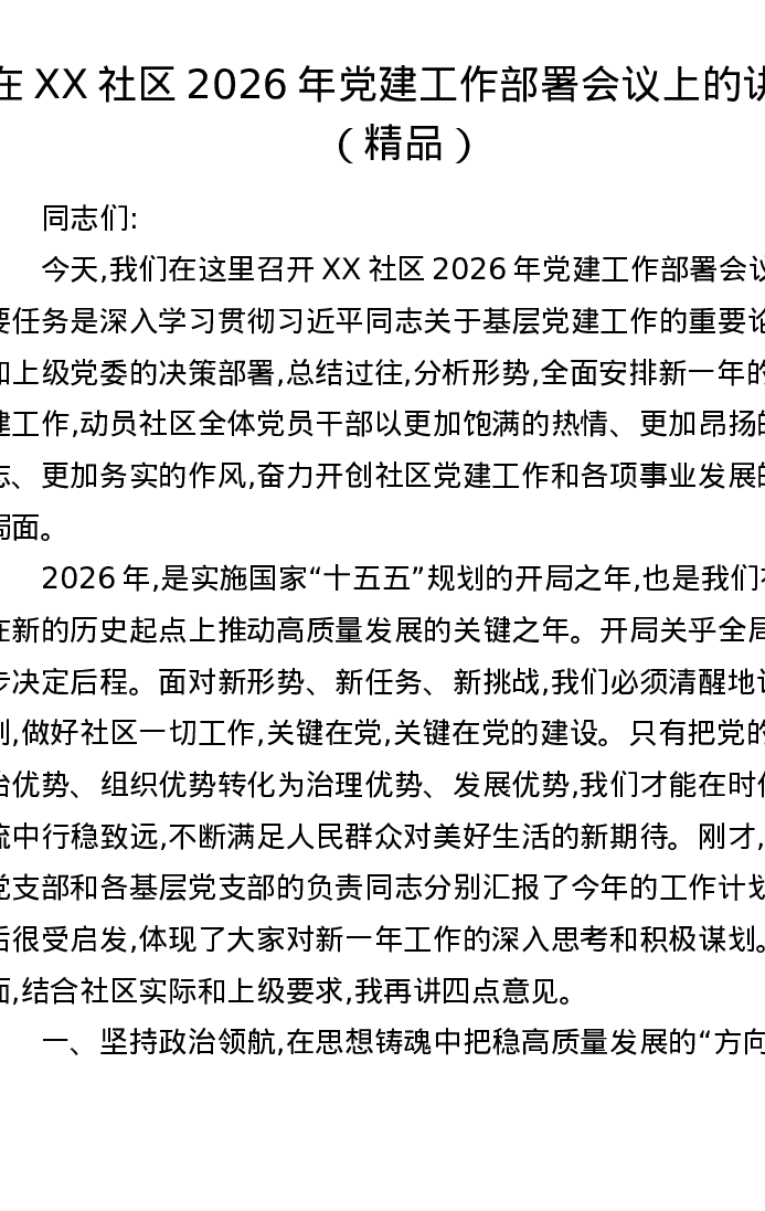 在XX社区2026年党建工作部署会议上的讲话