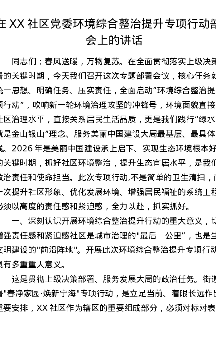 在XX社区党委环境综合整治提升专项行动部署会上的讲话