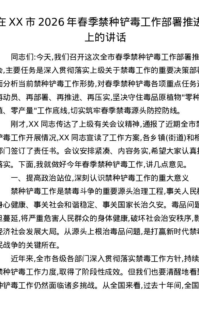 在XX市2026年春季禁种铲毒工作部署推进会上的讲话