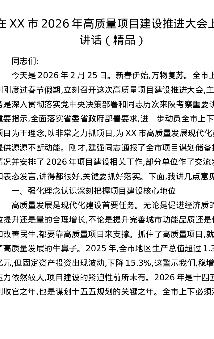 在XX市2026年高质量项目建设推进大会上的讲话