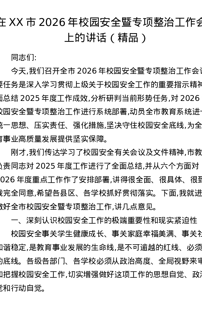 在XX市2026年校园安全暨专项整治工作会议上的讲话