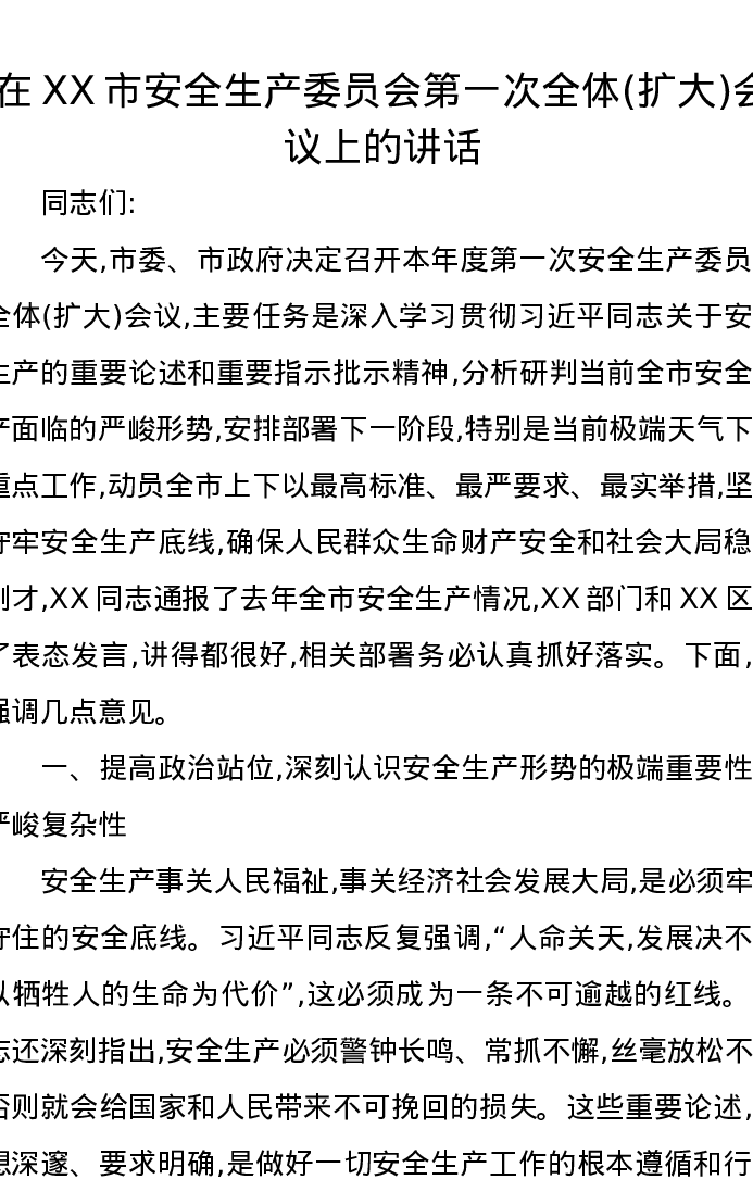 在XX市安全生产委员会第一次全体(扩大)会议上的讲话