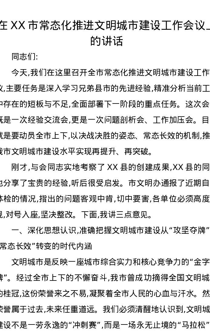 在XX市常态化推进文明城市建设工作会议上的讲话