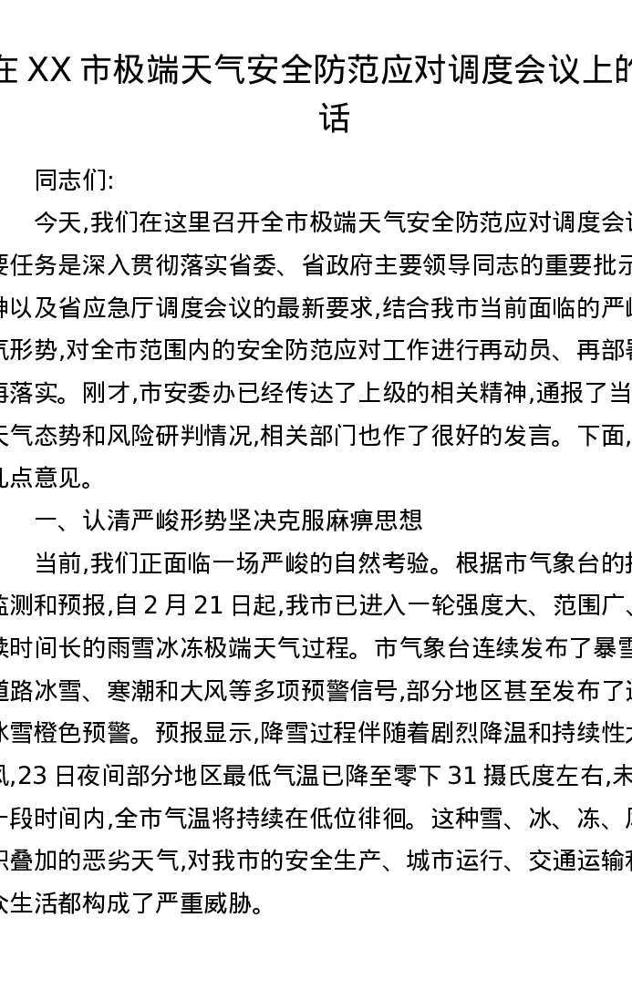 在XX市极端天气安全防范应对调度会议上的讲话