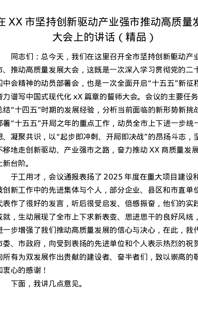 在XX市坚持创新驱动产业强市推动高质量发展大会上的讲话
